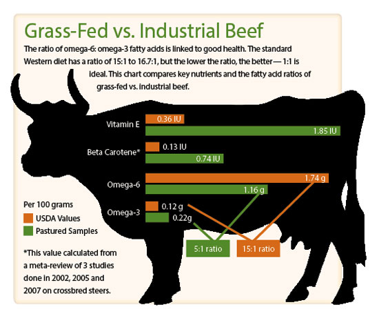 A figura acima mostra a diferença nas quantidades de vitamina E, beta-caroteno, ácidos graxos ômega-3 e ômega-6 entre as carnes de animais alimentados com grama (grass-feed) e com grãos (industrial beef)